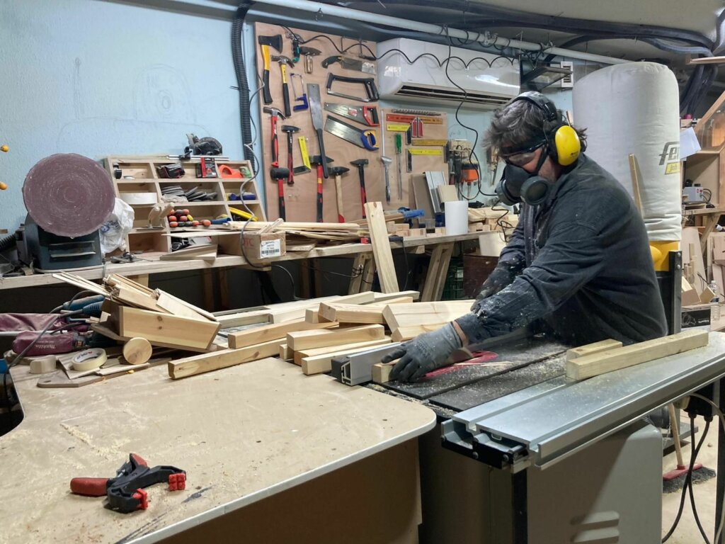 Thus, was born a small factory for high-quality beautiful wooden toys, manufactured by Hazira’s artist community and theatre staff AKA “Tech Poetry”. The toys are all made from recycled theatre sets. They will be sent to children hurt by the war, and the kindergartens which were established in the rehabilitation process. All factory proceedings will be contributed to the preparation of additional toys, increasing the production capacity of the improvised factory, and the integration of more artists in the manufacturing process.