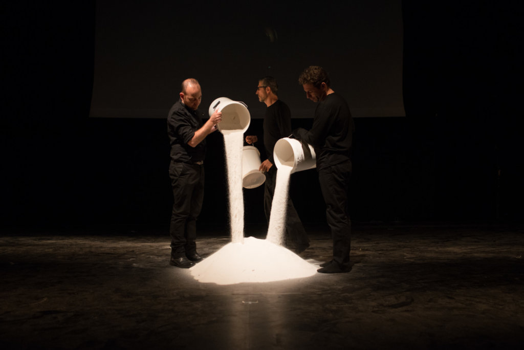 דליים של מלח נשפכים על הרצפה. יצורים קטנים סוללים כבישים ודרכים בים הלובן. יד קטנה מבצבצת בין הגרגירים, מנסה לחצות את הגבעה. המצלמה דולקת אחריה, משדרת על מסך את המנוסה