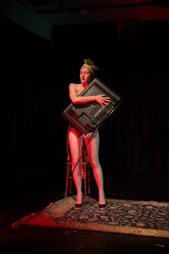גופה של אנה משודר על המרקע. הטלוויזיה מתחילה לבכות. אנה מחבקת אותה בחזה חשוף, כמו אמא מניקה. גוף לגוף. היא שרה לה שיר ערש עד שהיא נרגעת. בית ברוסית, בית בעברית.