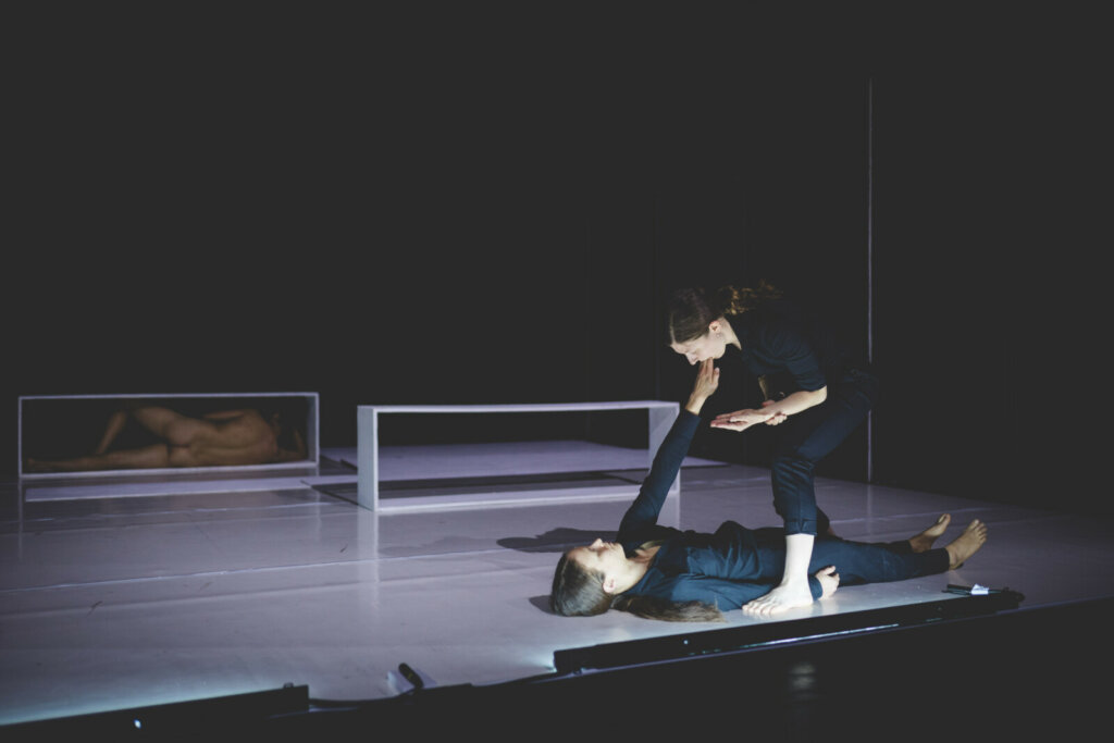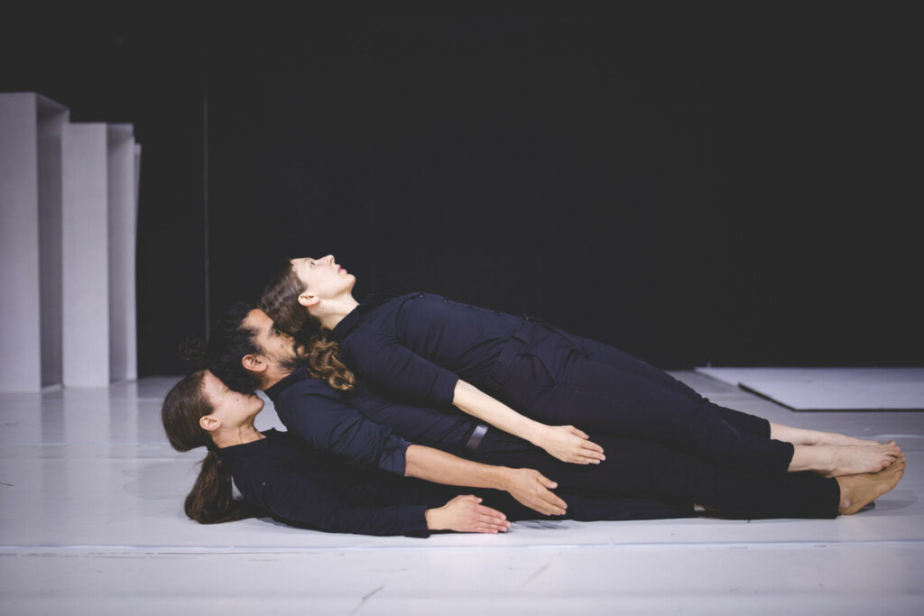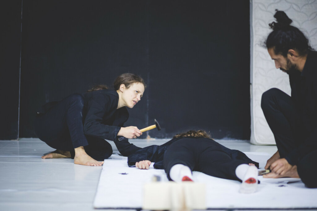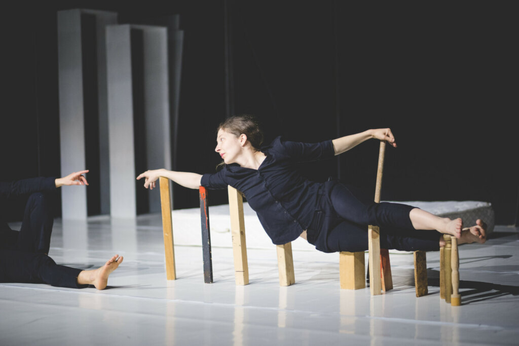 בתוך ההידמות העיקשת של הגוף לפסל וקריסתו, המופע נע בין בנייה לפירוק, מופרכות ומציאות, מופשטות וקונקרטיות.